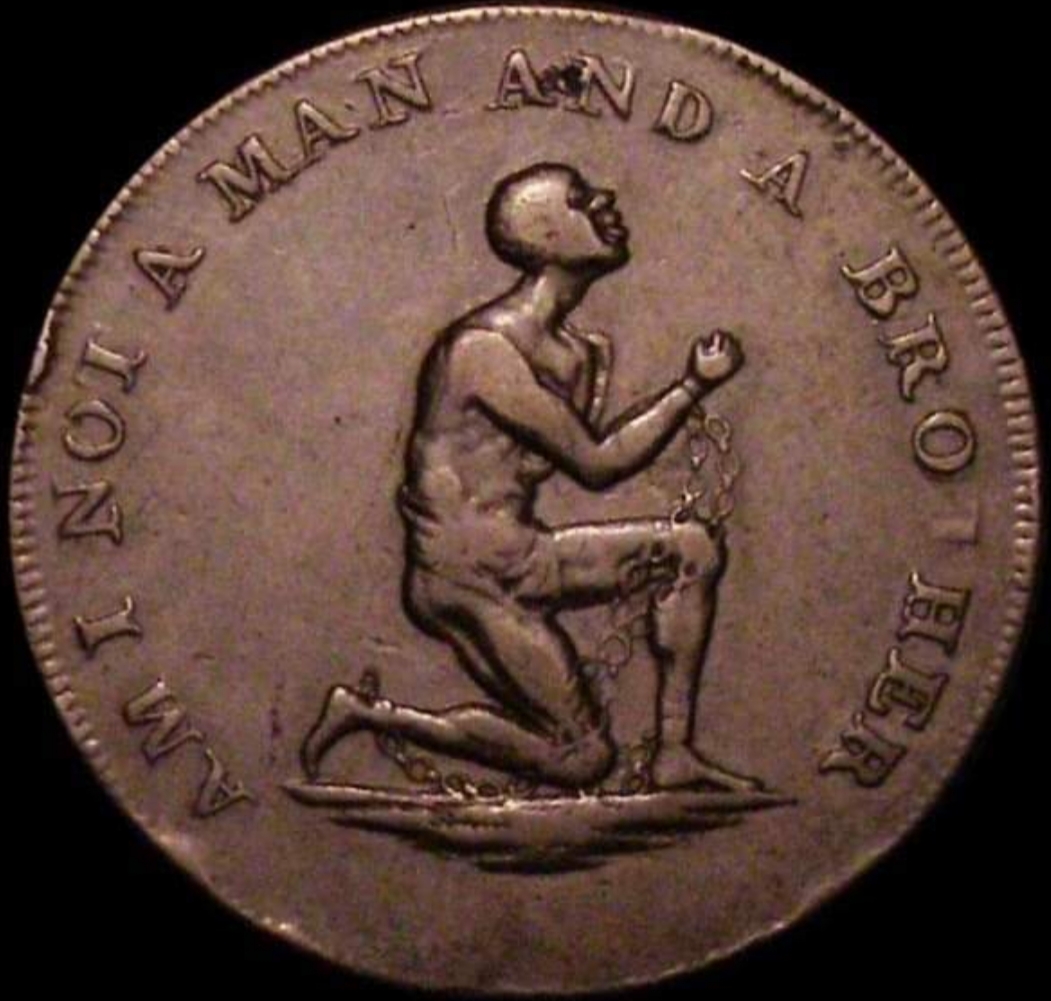 ‘Am I not a man and a brother’. ‘May slavery & oppression cease throughout the world’. On the edge is milled ‘Payable in Belfast, Dublin and Cork’. It is undated, but would have been produced in the 1790s, as where similar tokens in Britain and America. An Irish anti-slavery halfpenny token, sold to raise money to promote abolition.
